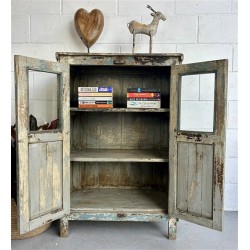 A statement cabinet defined by symmetry, texture, and authentic blue/grey/white patinas. Crafted from solid wood, the naturally weathered finish reveals layered tones and quiet character, giving the piece depth without excess.