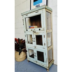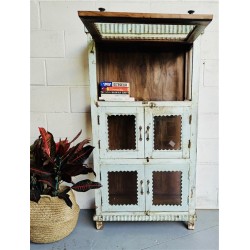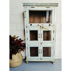 A tall wooden cabinet with a softly aged finish and decorative detailing. Crafted from solid wood, the pale, weathered surface shows natural wear and subtle blue/grey tonal variation, giving the piece a calm, lived-in character.