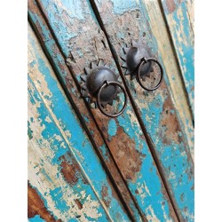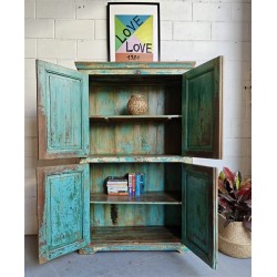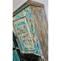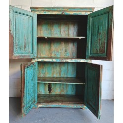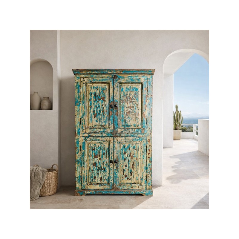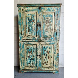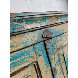 A substantial wooden cabinet with a beautifully aged blue finish and classic panelled detailing. Crafted from solid wood, the surface shows layers of worn paint and natural patina, giving the piece depth and a relaxed, lived-in character.
