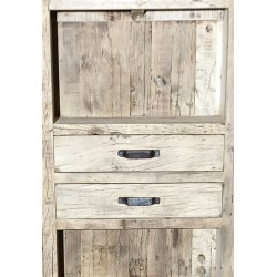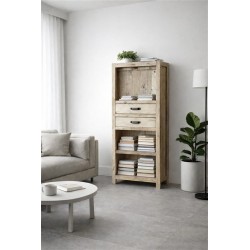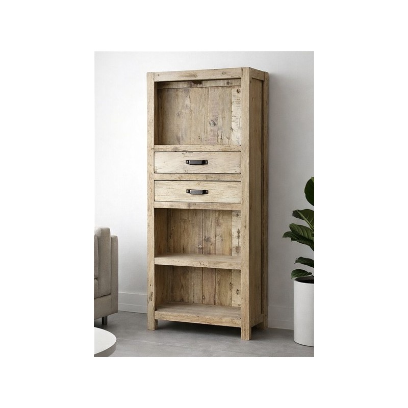 Crafted from solid wood with a naturally aged finish, it features open shelving for display and two drawers for keeping smaller items neatly tucked away.