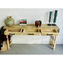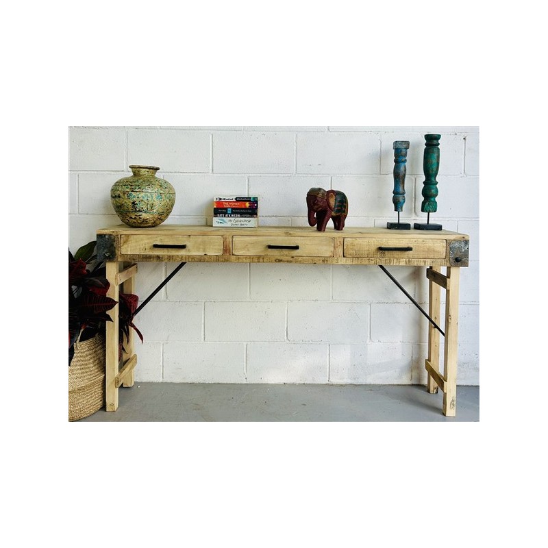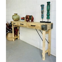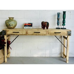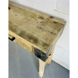 Rustic wooden console table featuring a solid timber top and a naturally aged finish that highlights the character and grain of the wood.