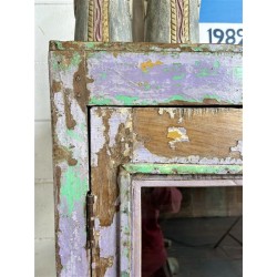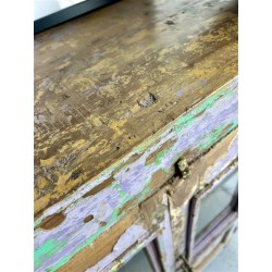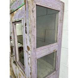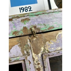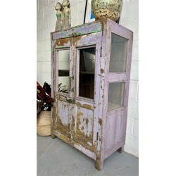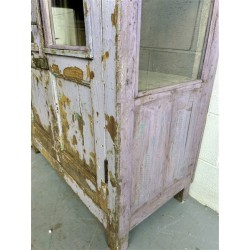 Vintage wooden cabinet featuring a beautifully weathered, multi-layer lilac painted finish that highlights its authentic aged character.