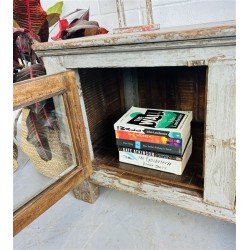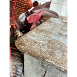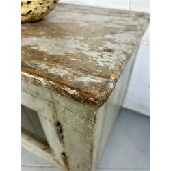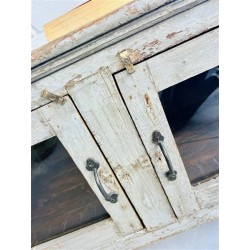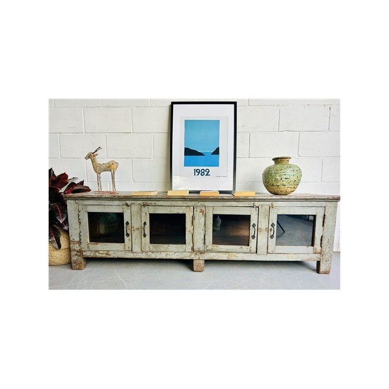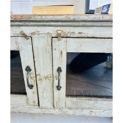 Rustic low wooden cabinet featuring a beautifully weathered grey toned painted finish with natural wear that highlights its authentic vintage character.