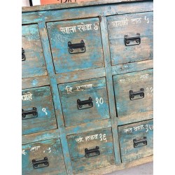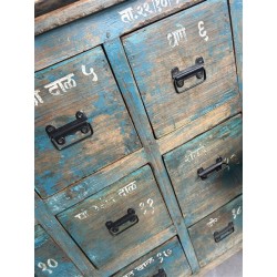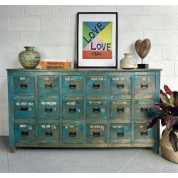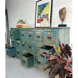 Designed with multiple small drawers, each fitted with classic metal handles, the cabinet offers practical storage while adding visual interest to any space. Its compact, low-profile silhouette makes it ideal for living rooms, hallways, bedrooms, or styled retail environments where texture and authenticity matter. The aged detailing gives the impression of a well-travelled heirloom, perfect for interiors that favour natural materials, neutral palettes, and curated simplicity.