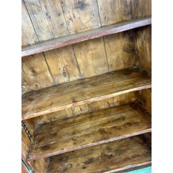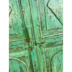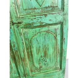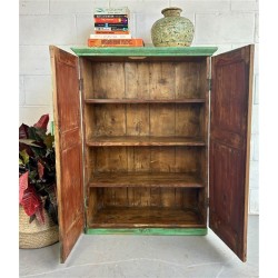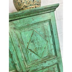 Handcrafted in Rajasthan, this narrow wooden cabinet showcases a beautifully distressed green finish that highlights its vintage character.