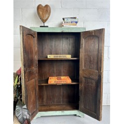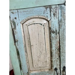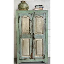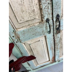 A charming rustic wooden cabinet featuring distressed mint-green and soft blue tones with cream panelled doors.