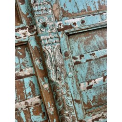 Its weathered patina and intricate carvings reflect the charm of traditional craftsmanship, while the vibrant distressed blue finish adds character.