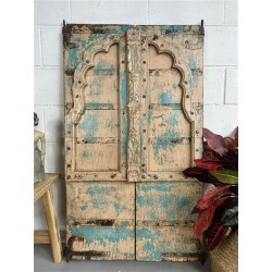Featuring hand-carved arch details, layered distressed turquoise and natural wood tones, and authentic aged patina, this statement piece brings warmth and global charm to any interior.
