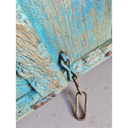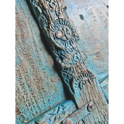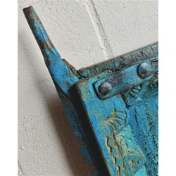 Its weathered patina and intricate carvings reflect the charm of traditional craftsmanship, while the vibrant distressed blue finish adds character.