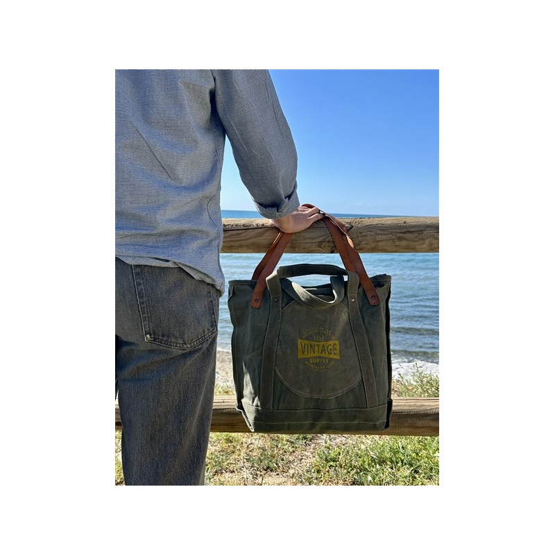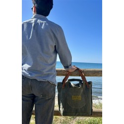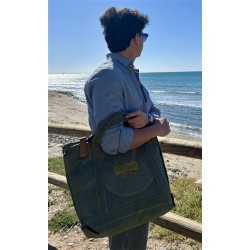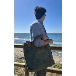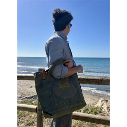 Fabricado con tela reciclada de antiguas tiendas militares, cada bolso es único.