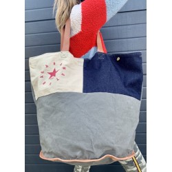 Material: Hecho con tela nueva con un lavado vintage, así cada bolso es original y diferente. Asas y borde de piel.
