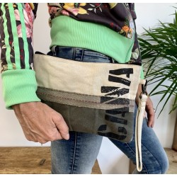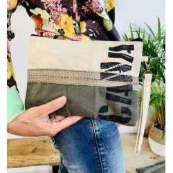 Megan PG43 con las primeras letras "CA NA" en el color arena y verde militar es un clutch que refleja la esencia de Casa Natura de una manera sutil pero distintiva. Estas letras representan la marca y la identidad de Casa Natura, y al utilizar los colores arena y verde militar, se comunica un sentido de conexión con la naturaleza y la tierra.