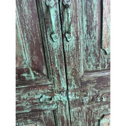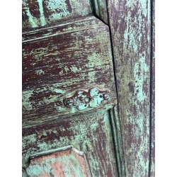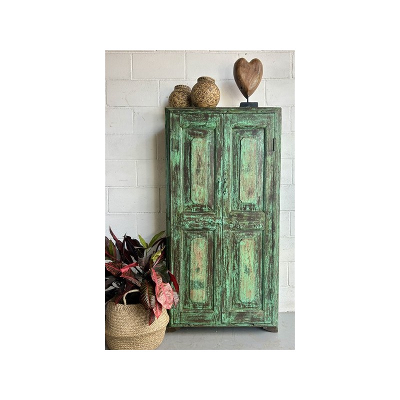 Un armario alto de madera con un distintivo acabado envejecido y líneas fuertes y sencillas. Fabricado en madera maciza, su superficie presenta capas de tonos verdes apagados con el desgaste natural, lo que le aporta profundidad y carácter sin resultar pesado.