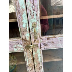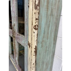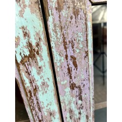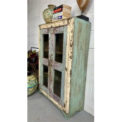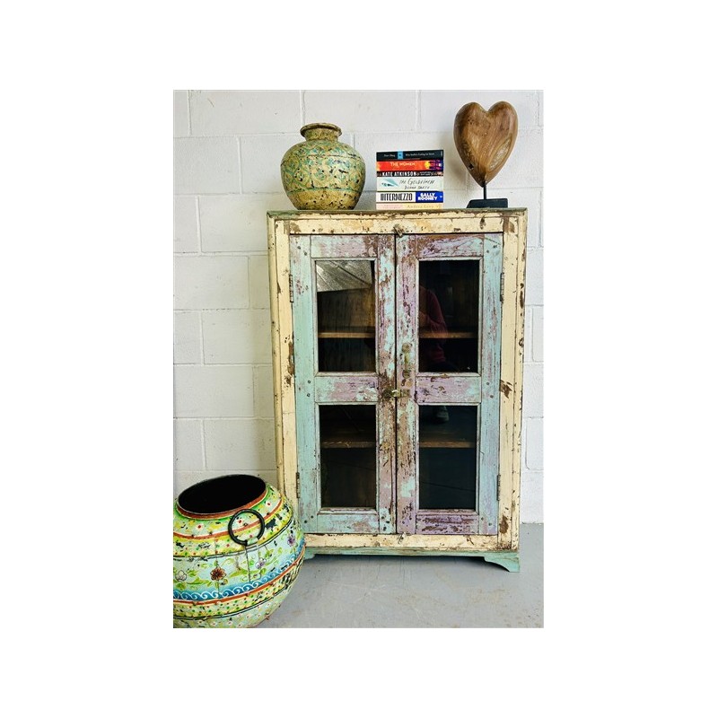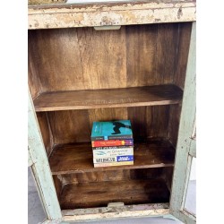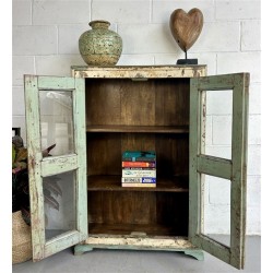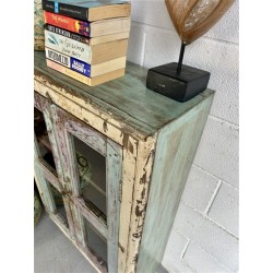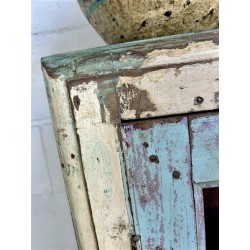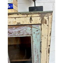 Un armario compacto de madera con un suave acabado envejecido y sutiles detalles industriales. Fabricado en madera maciza, su superficie presenta tonos tenues de azul pálido, crema y desgaste natural, lo que le confiere un aire relajado y desgastado.